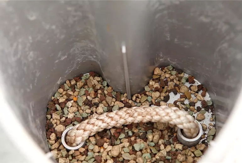 Bauen Sie Ihren Blumentopf mit Wasserspeicher nach Anleitung zusammen. Sollten die Abzugslöcher zu groß sein, so dass das Granulat durchfallen kann, legen Sie einfach ein paar Tonscherben darüber. Füllen Sie eine Schicht des Tongranulats ein.